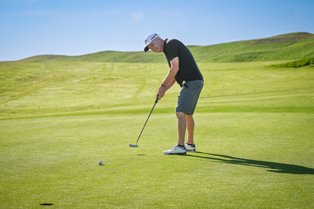 Se enkelheten i bildens tre delar. Blå himmel, gröna kullar och fairway och en helt fokuserad Mikael som puttar för birdie på Torslanda hål #15 som kan vara din bästa kompis i medvind men din värsta motståndare i mot- och sid-vind. Denna dagen var hål #15 på sitt bästa humör och lugnet i Mikaels ansikte utstrålar – Harmoni!